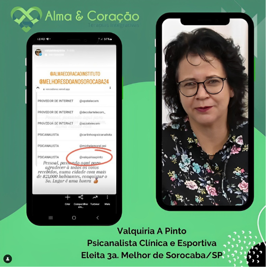 Temos a honra de anunciar que Valquiria A. Pinto, nossa fundadora e psicanalista clínica e esportiva, foi eleita a melhor psicanalista de Sorocaba/SP no prêmio Melhores do Ano 2024! Este reconhecimento destaca sua dedicação e excelência no campo da psicanálise.